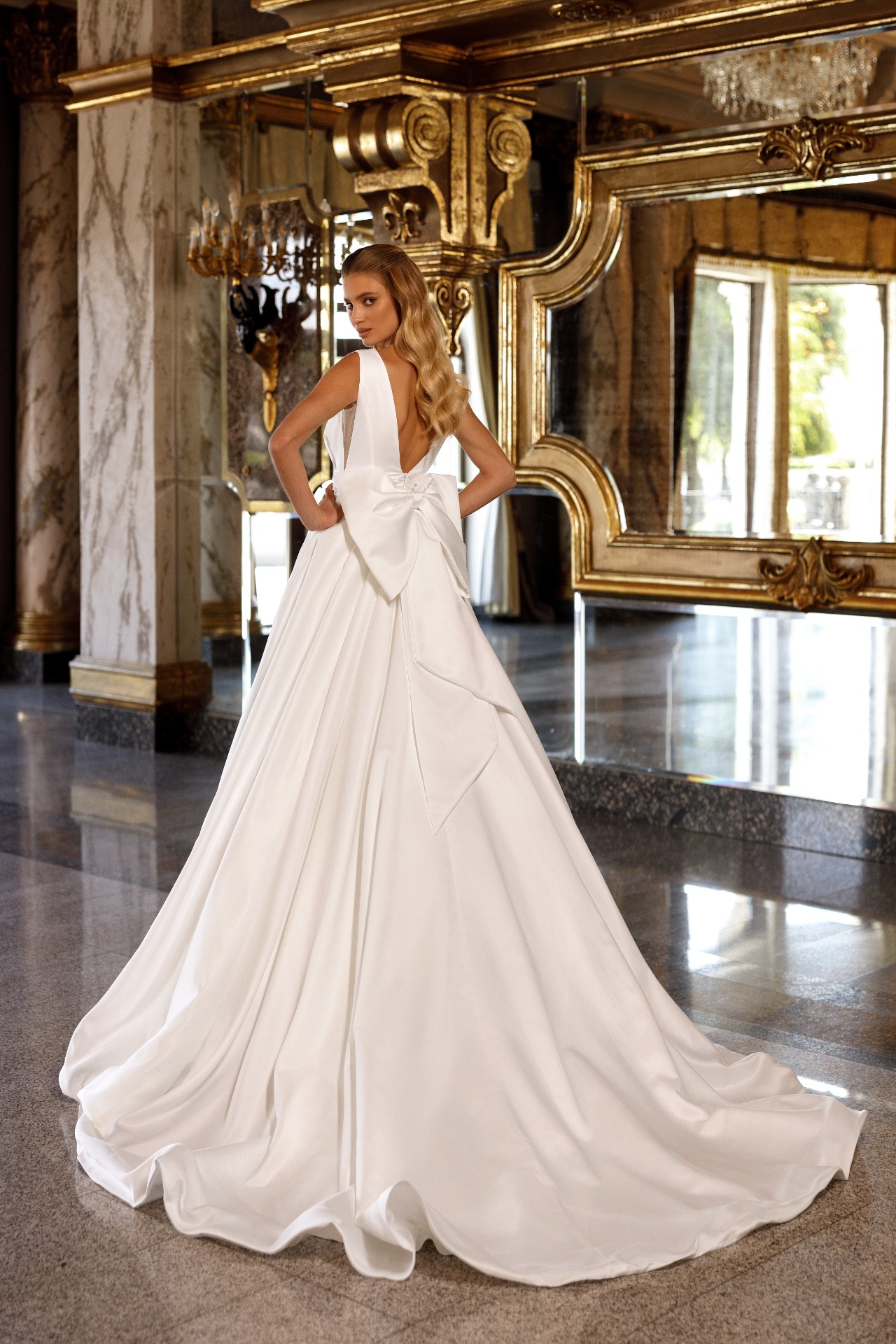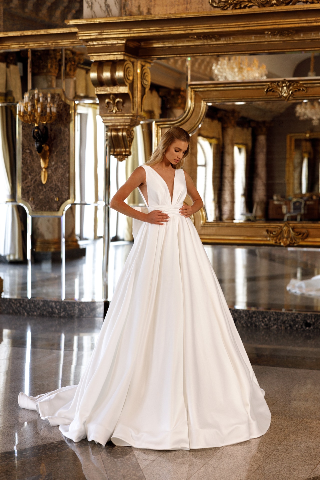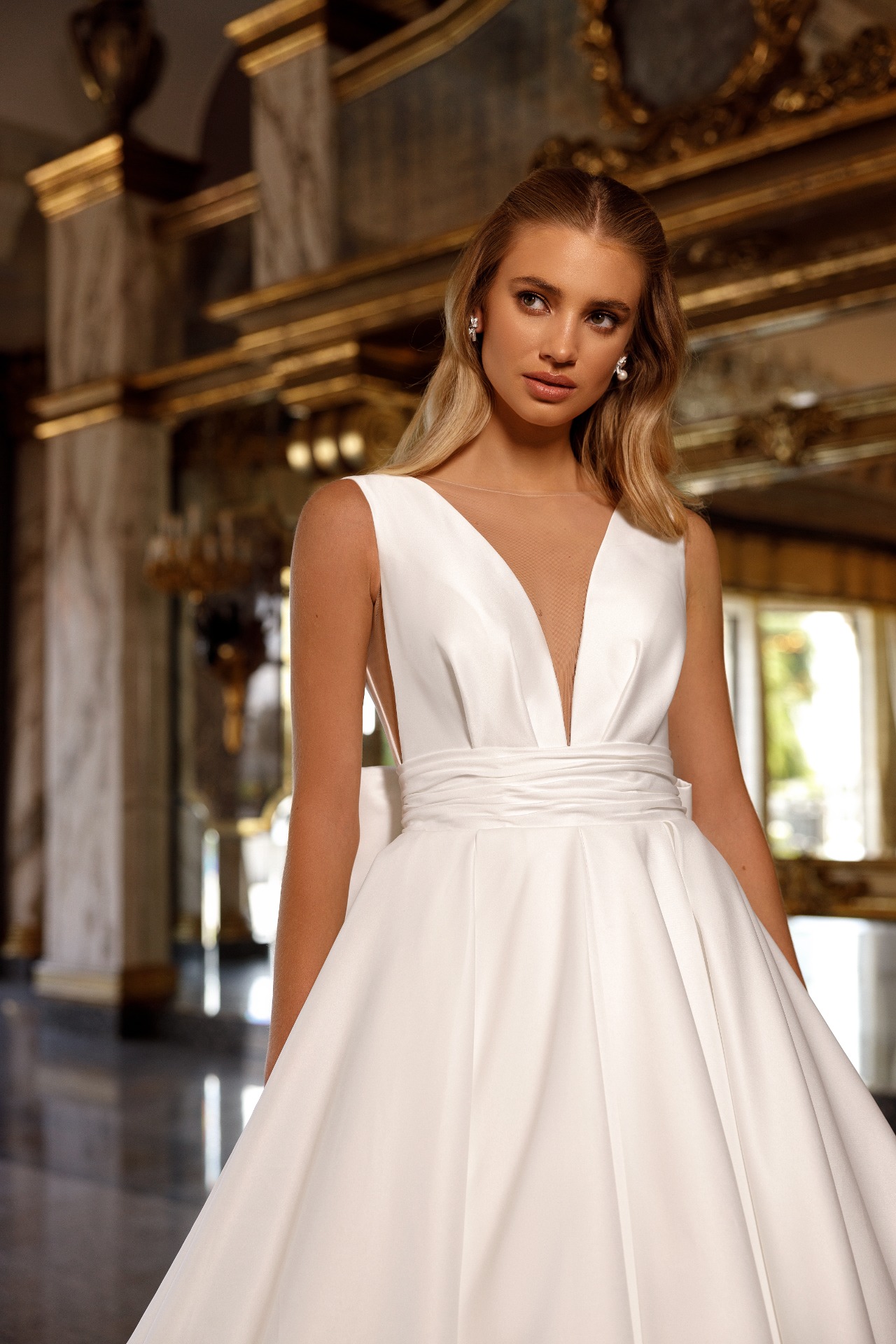 Model Bibiana je navrhnutý bez ramienok, vďaka čomu krásne odhaľuje ramená a dekolt. Úplne hladký materiál bez čipky a aplikácií pôsobí luxusne a čisto, pričom necháva vyniknúť siluetu nevesty. Tento typ šiat je ideálny pre moderné mestské svadby, civilné obrady aj elegantné večerné hostiny.