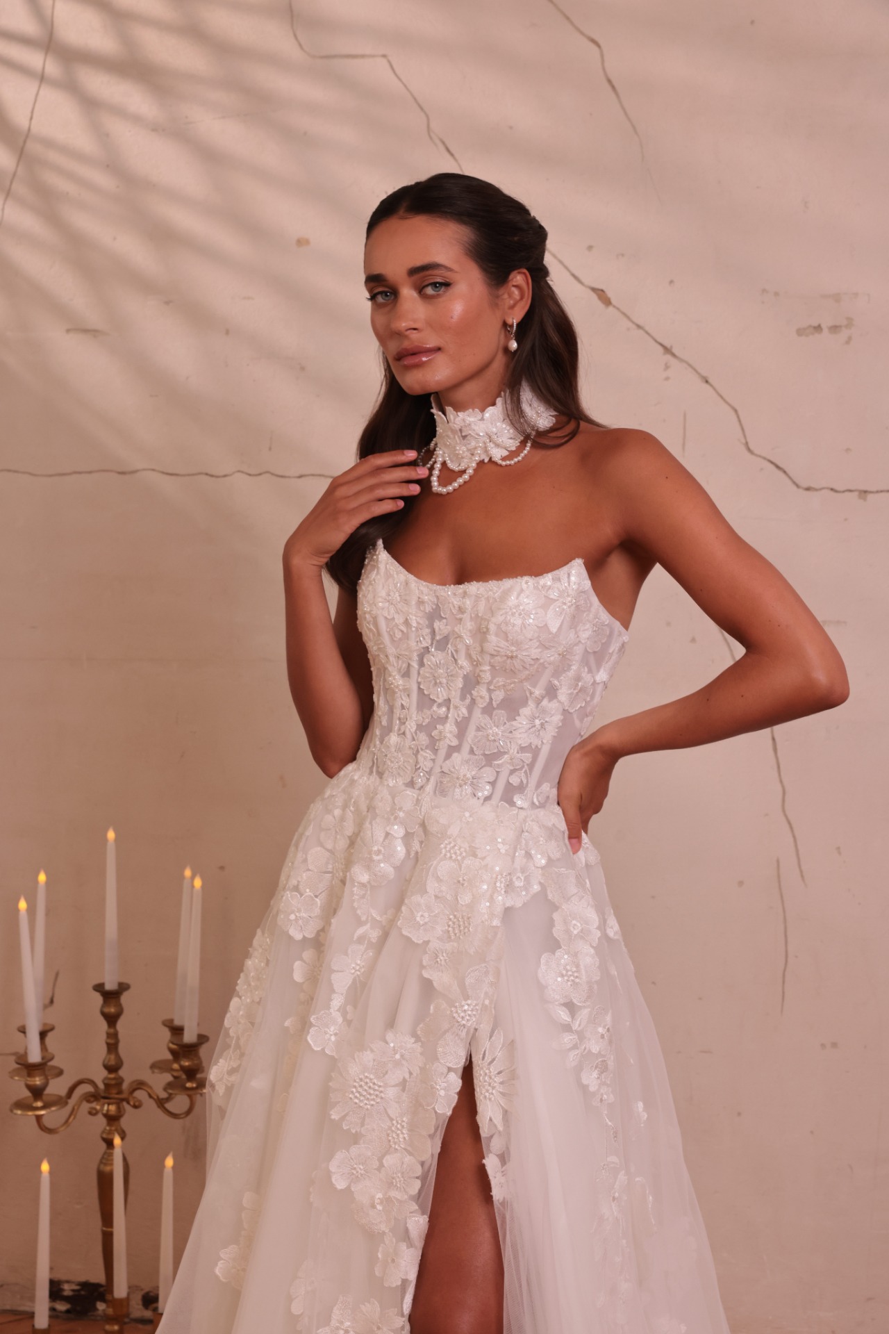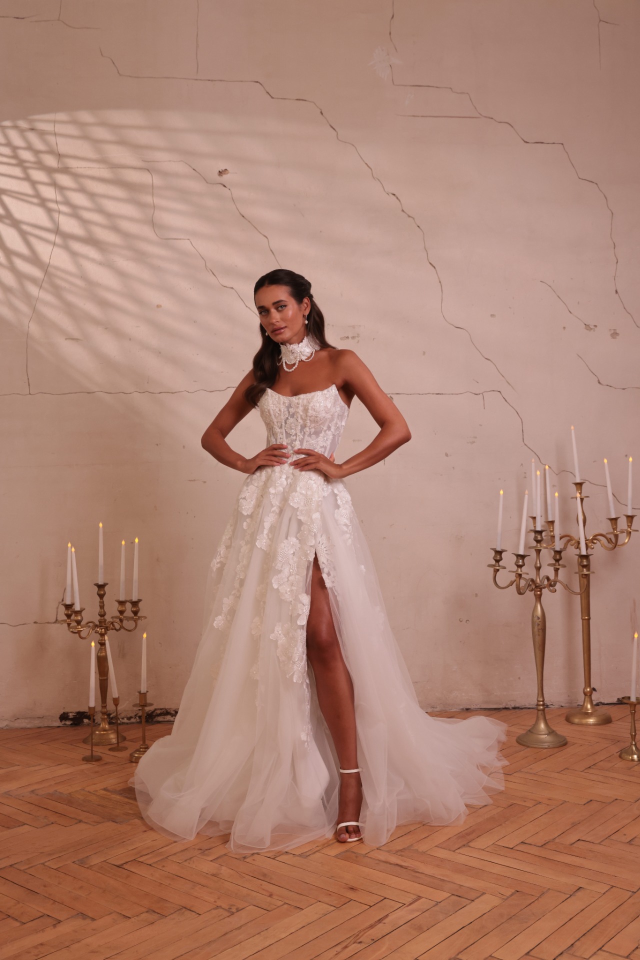 Tvarovaný korzet krásne zvýrazní siluetu, opticky zoštíhli pás a poskytne spoľahlivú oporu počas celého dňa. Rozparok na sukni dodáva modelu ľahkosť, zmyselnosť a umožňuje pohodlný pohyb pri chôdzi aj tanci.