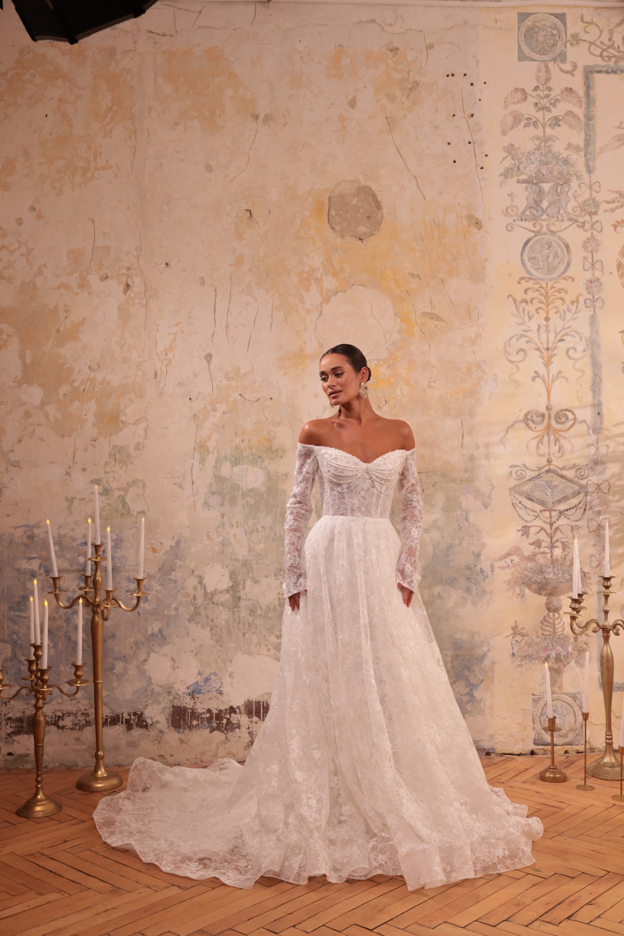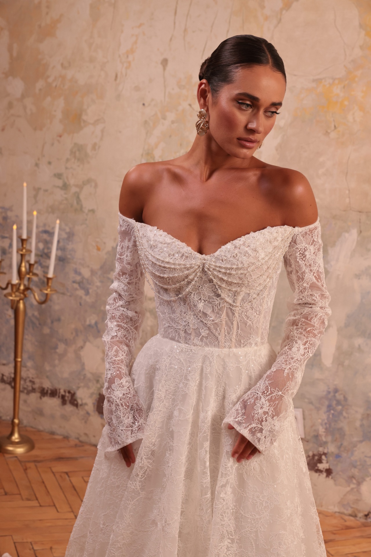 Moderný korzetový strih krásne tvaruje siluetu, zvýrazňuje pás a poskytuje oporu aj pri celodennom nosení. Dlhý rukáv z jemnej čipky pôsobí elegantne a decentne, pričom necháva vyniknúť detailné vzory čipky na rukách a ramenách.