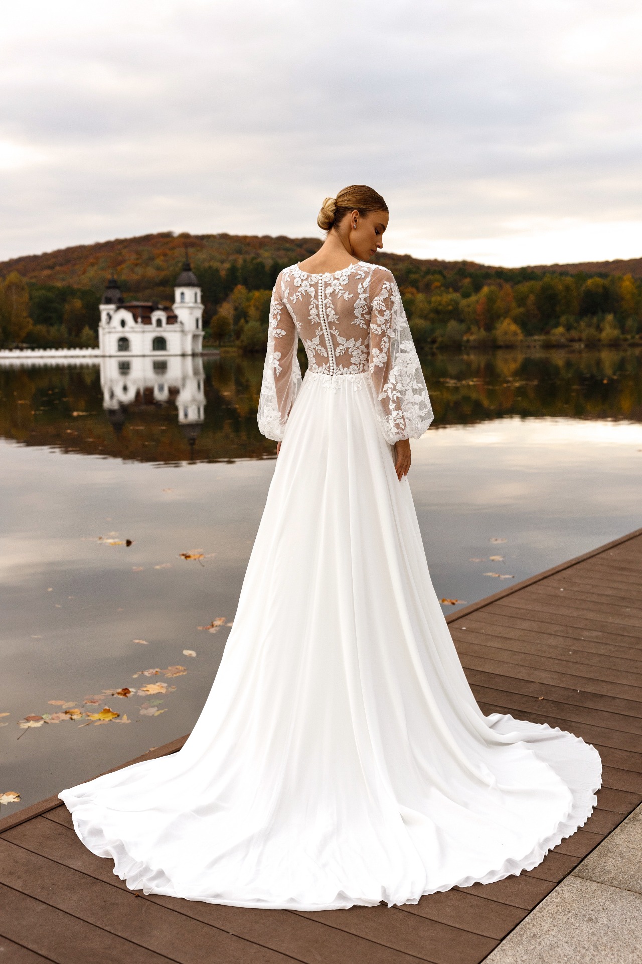 Silueta svadobných šiat v tvare A lichotí väčšine postáv, jemne obopína pás a plynulo sa rozširuje smerom k zemi. Dlhé voľné rukávy dodávajú modelu romantický nádych a zároveň poskytujú pohodlie počas celého svadobného dňa.