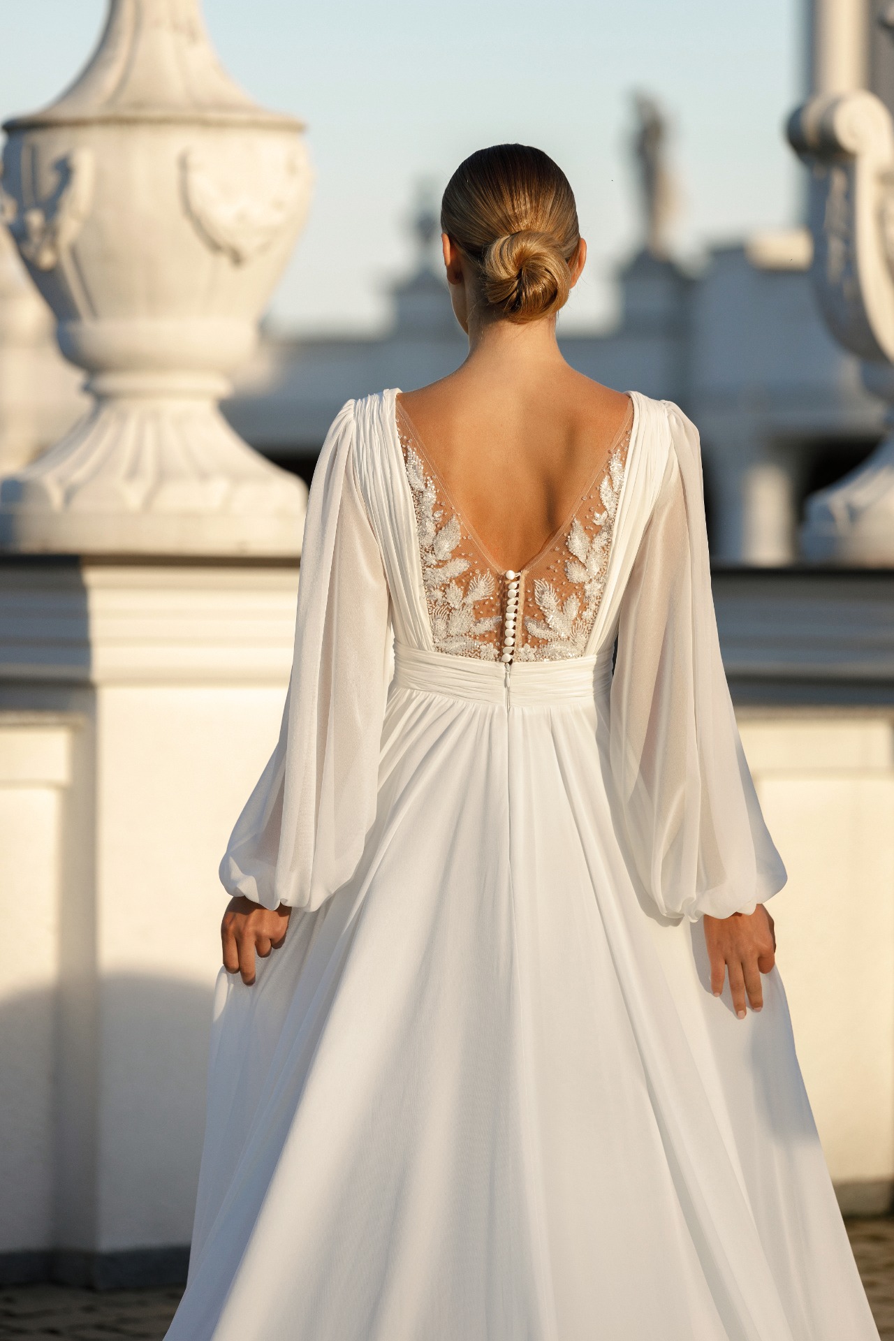 Voľné dlhé rukávy pôsobia étericky a žensky. Na ich zakončení sa nachádzajú telové sieťované manžety bohato vyšívané korálkami, ktoré nadväzujú na zdobenie živôtika a vytvárajú harmonický celok. Tento detail zvýrazňuje zápästia a dodáva celkovému vzhľadu noblesu.
