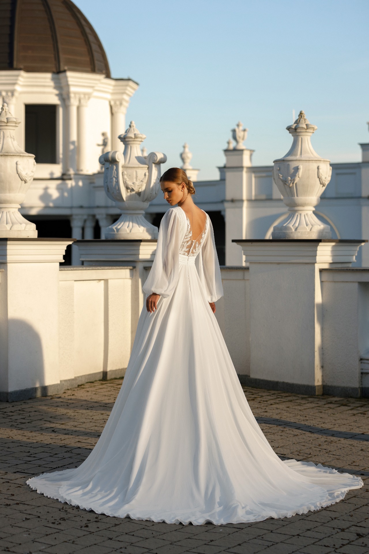 Výstrih a zadný diel sú vytvorené z telovej sieťoviny, ktorá splýva s pokožkou a vytvára efekt odhaleného dekoltu a chrbta. Sieťovina je bohato vyšívaná kamienkami a zdobená čipkou doplnenou korálkami a flitrami, čo šatám dodáva jemný lesk a romantický charakter.