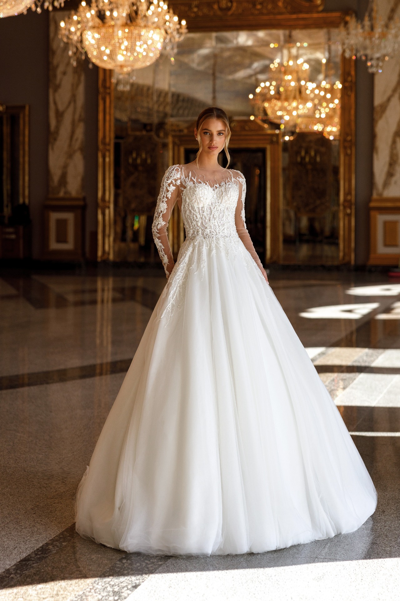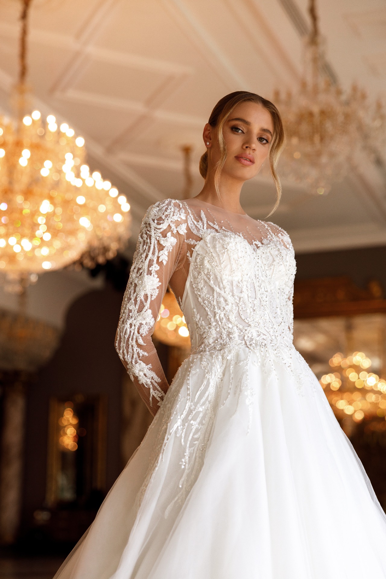 Svadobné šaty OFÉLIA sú romantickým modelom pre nevestu, ktorá túži po elegancii a jemnom lesku. Dlhé rukávy sú bohato vyšívané krásnou čipkou, ktorá decentne zvýrazňuje línie rúk a dodáva šatám noblesný charakter.