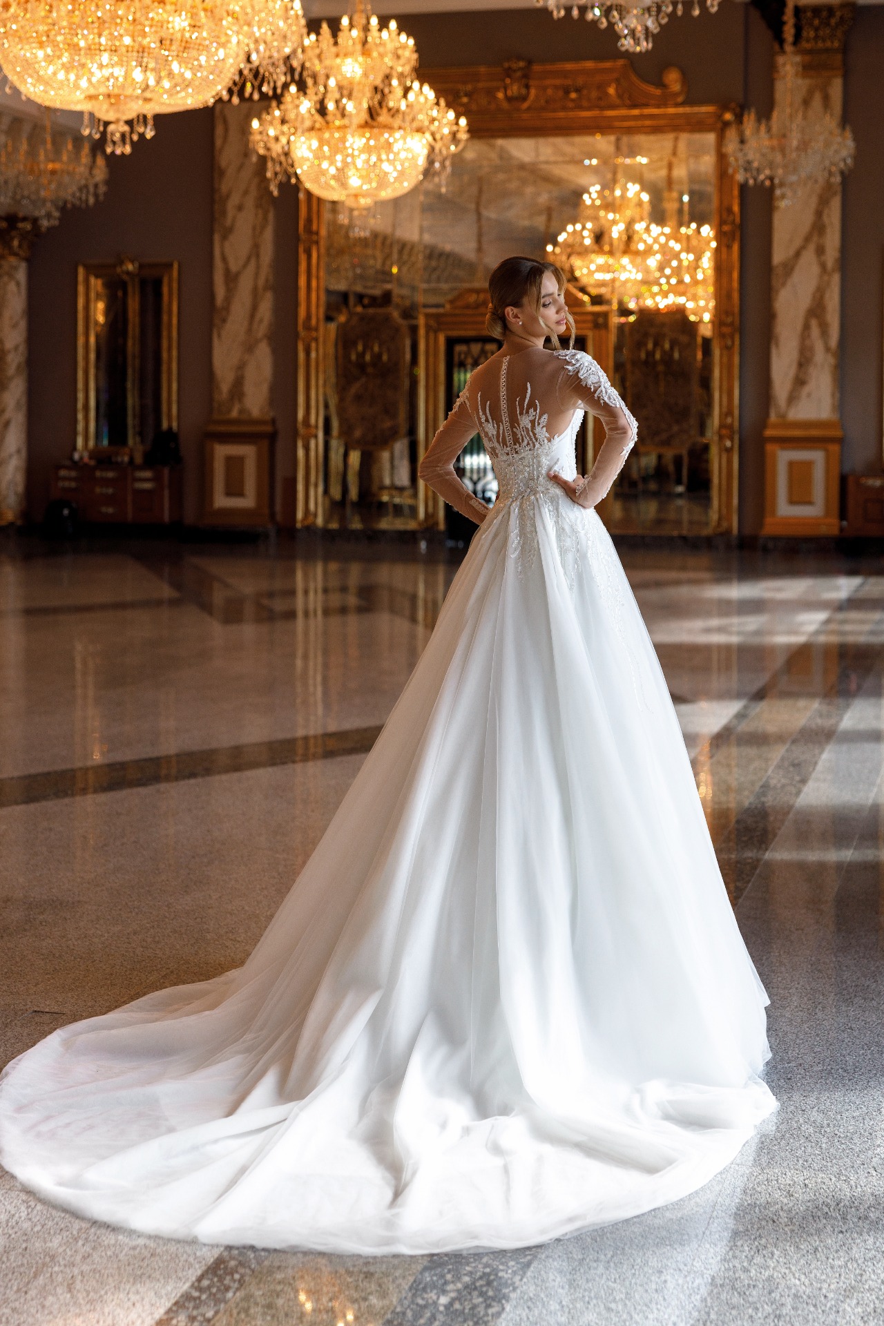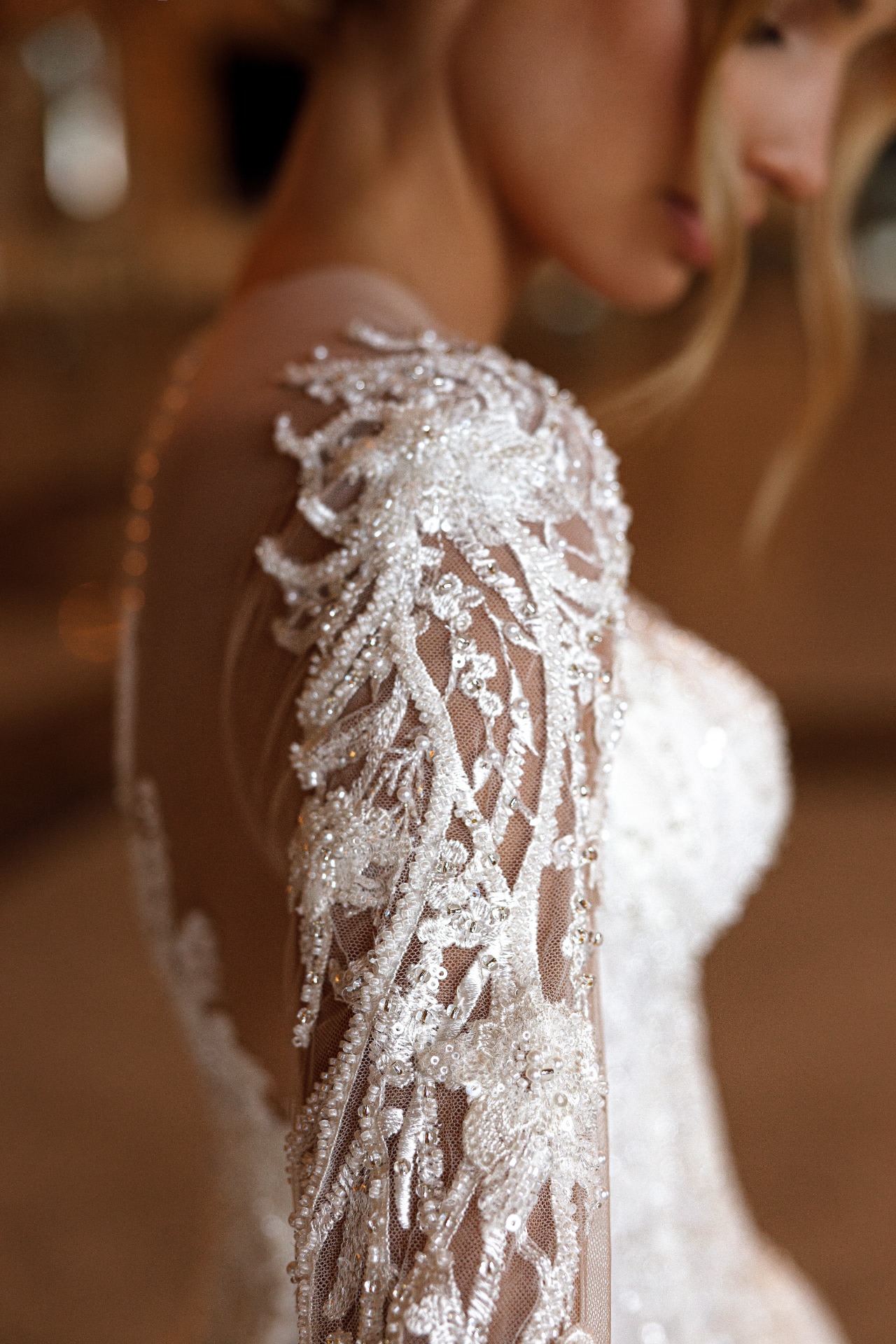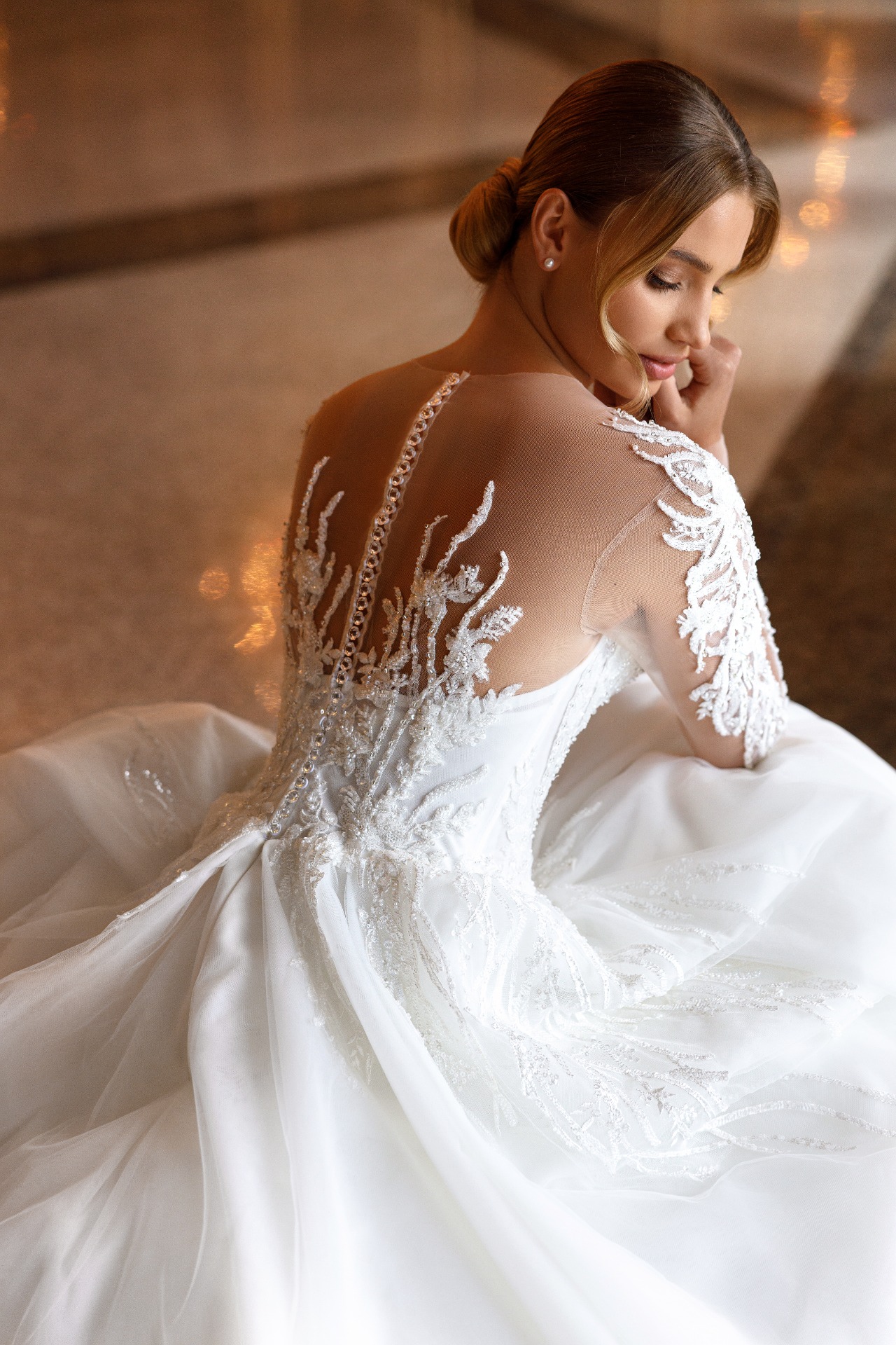 Precízne tvarovaný živôtik je zdobený lesklými čipkami, ktoré plynulo prechádzajú do zadného dielu. Zadná časť šiat je rovnako bohato dekorovaná, čím vytvára harmonický a luxusný vzhľad zo všetkých strán. Čipka jemne odráža svetlo a pri pohybe vytvára očarujúci efekt.
