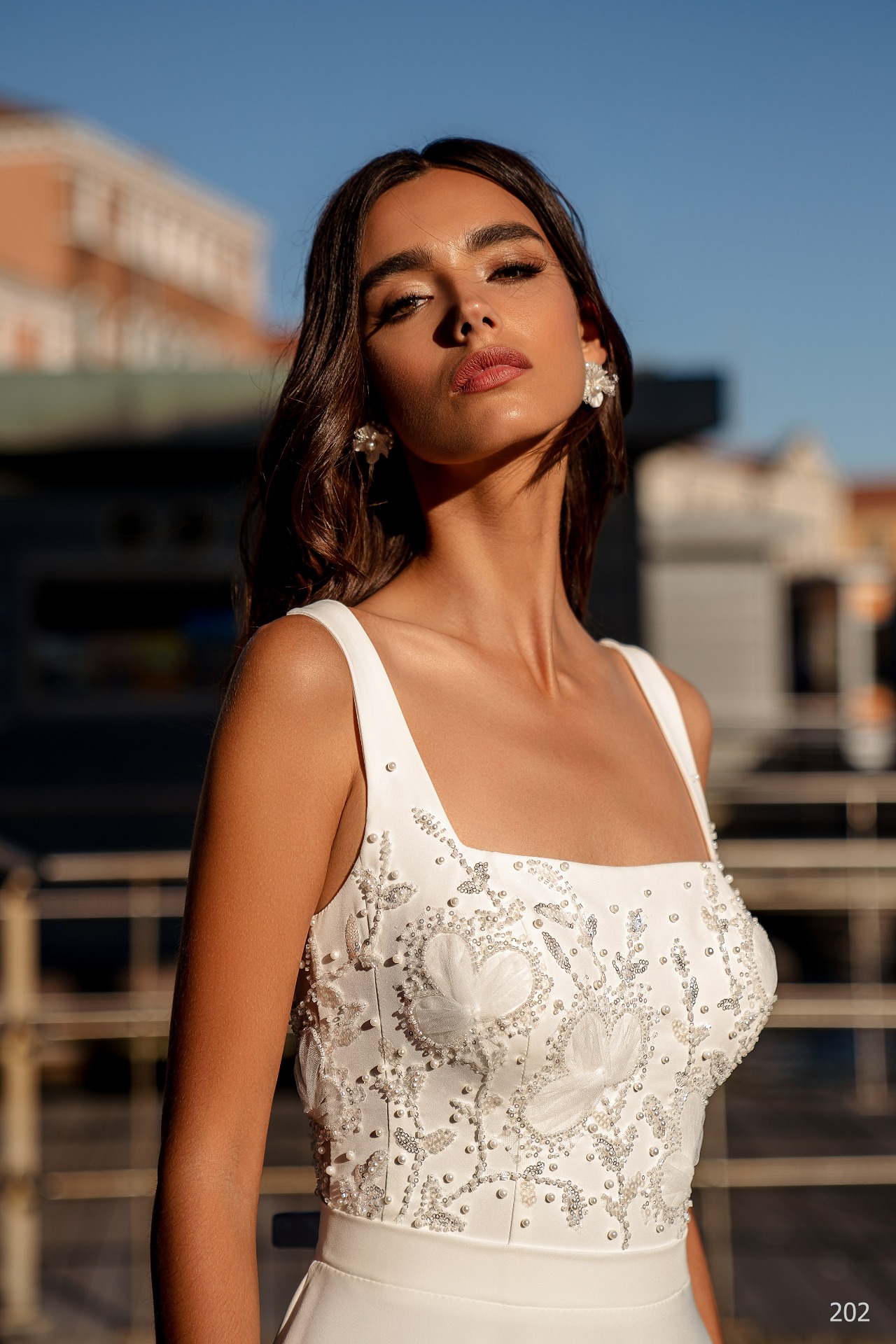 Svadobné šaty sú na ramienka, sukňa je hladká ,ale padavá. Svadobné šaty sú vhodné do teplých letných dní, pre svoju pohodlnosť, alebo pre nevesty, ktoré uprednostňujú na svadbe pohodlie.