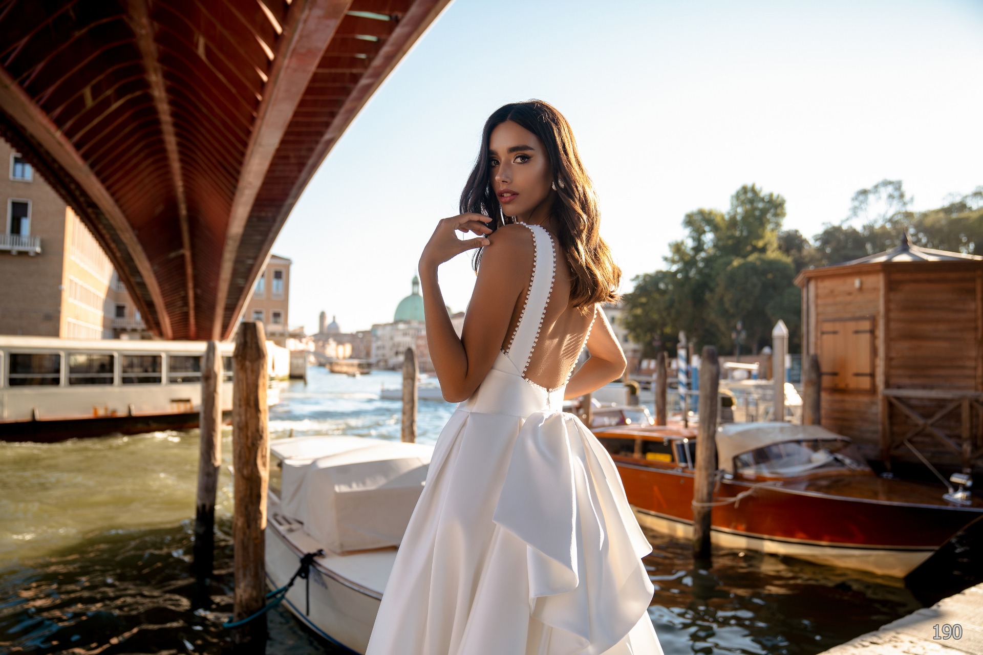 Hladké minimalistické a elegantné svadobné šaty, ktoré zvýrazňujú ženskú jemnosť a ladnosť.