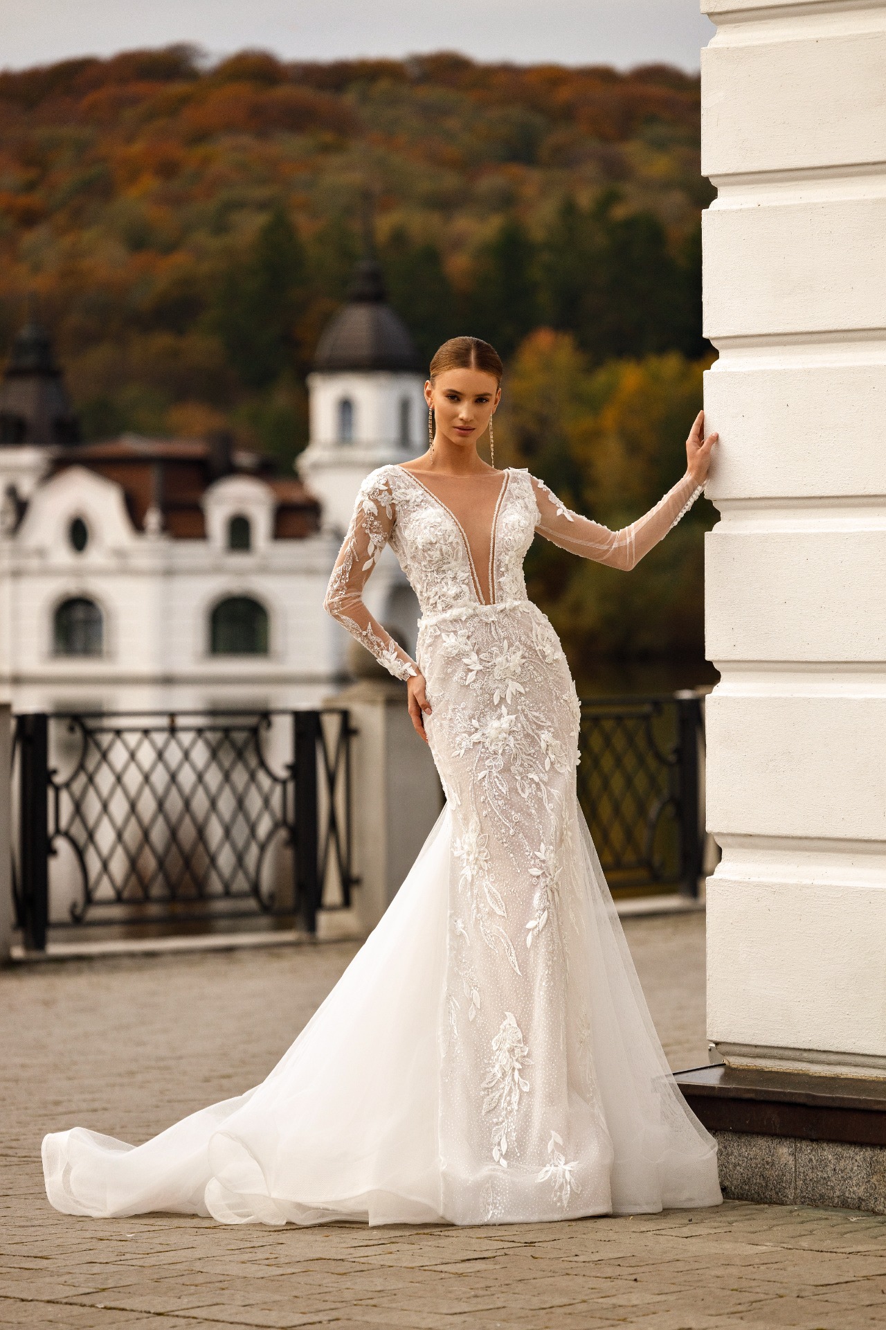 Svadobné šaty TERESA sú elegantné úzke šaty s dlhými rukávmi, ktoré sa smerom dole jemne rozširujú a vytvárajú ženskú, plynulú siluetu. Celé šaty sú potiahnuté jemnou čipkou, ktorá dodáva modelu romantický a nadčasový charakter vhodný pre modernú nevestu.